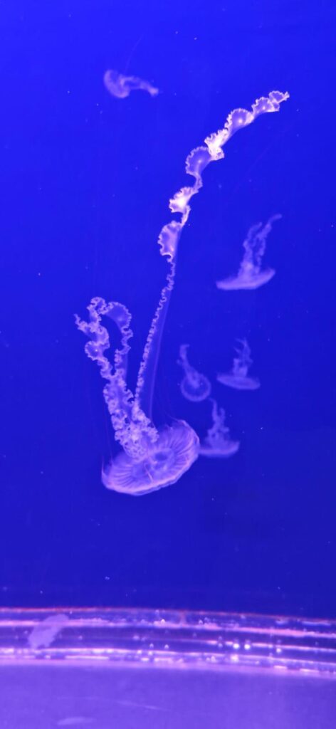 Menší skupinka žáků se místo této výstavy rozhodla navštívit expozici Svět medúz, kde je čekala fascinující podívaná na stovky medúz různých druhů v barevně nasvícených akváriích.
